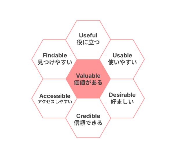 ハニカム構造では、優れたUXを提供するために必要な6つの側面が定義されています。これらを満たすことで、ユーザーにとって価値のある(valuable)サービスが実現されるとされています。