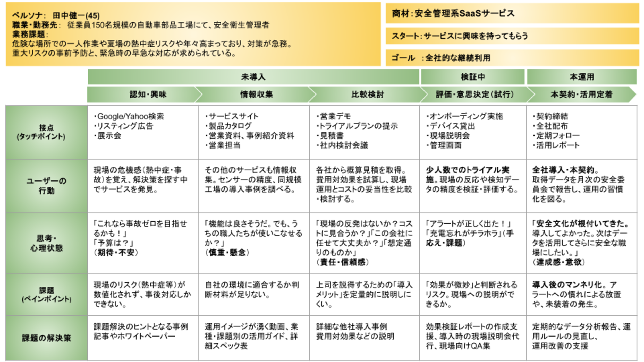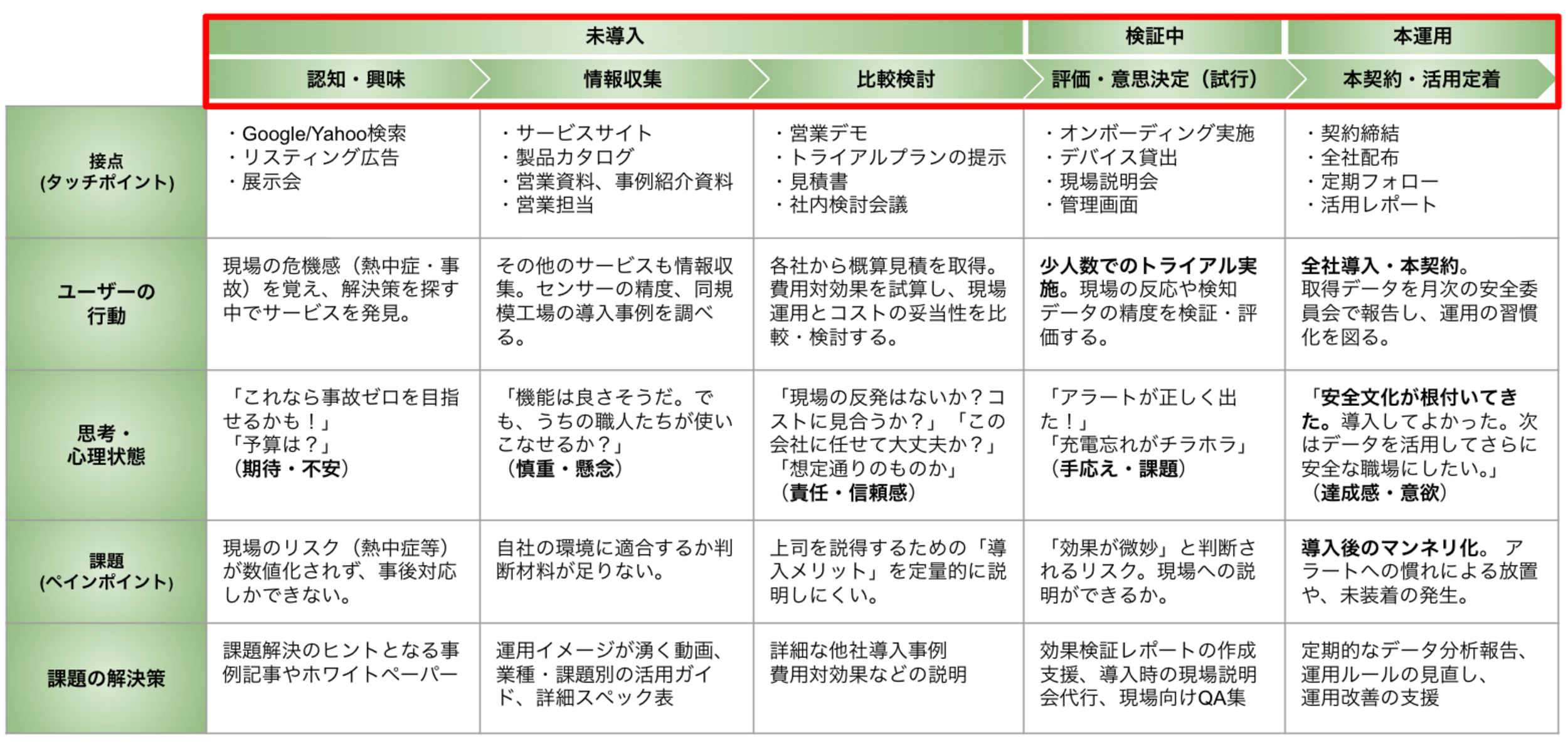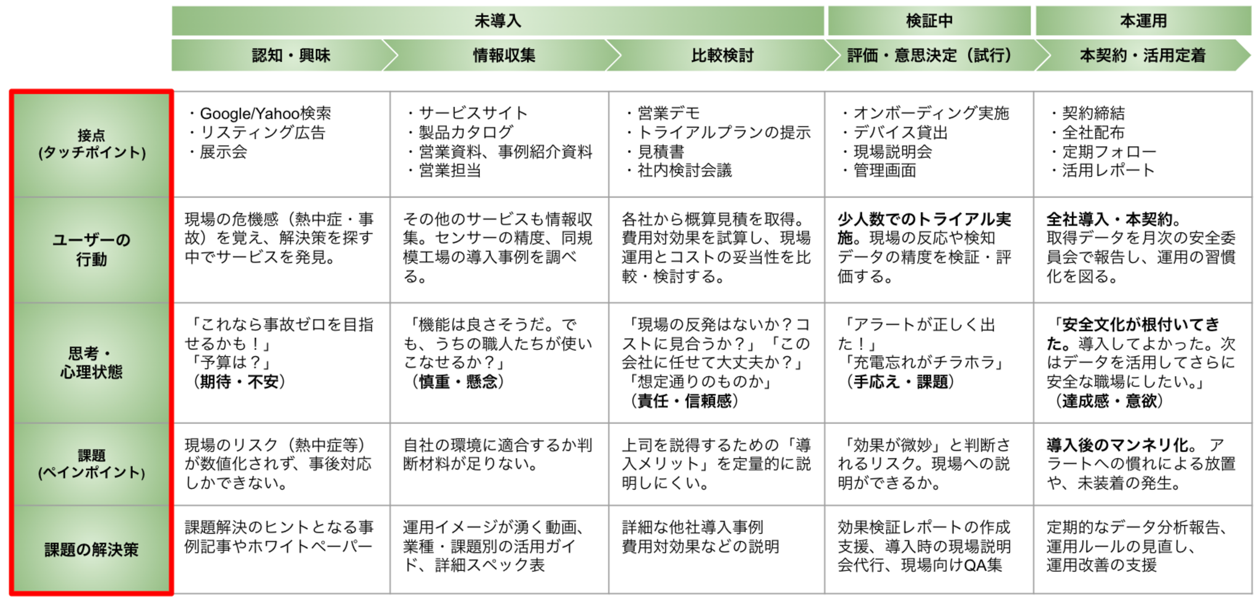 縦軸には、各フェーズにおいてユーザーがどのような状態で、どのような壁にぶつかっているかを多角的に分析します。