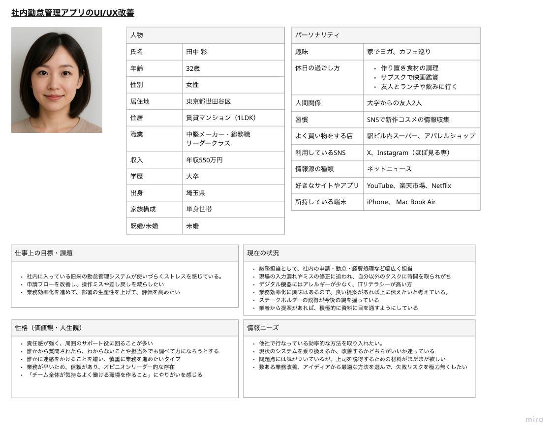 例:「東京都世田谷区在住、32歳女性会社員の田中さん。週末は作り置き食材の調理や家でヨガをして過ごす。情報源はネットニュースで、ITリテラシーは高い。最近の悩みは、現場のミスの対応等、自身のタスク以外の作業が多く発生しており、月末月初になると残業時間が多くなっていること。」