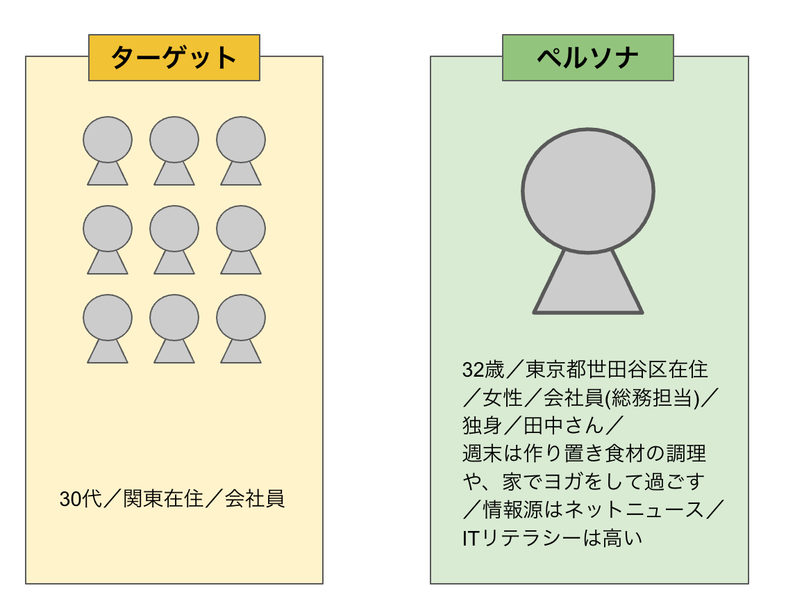 ターゲットは「どのような層に届けるか」を定義するもので、ペルソナは「その層の中の具体的な一人を設定する」ものです。